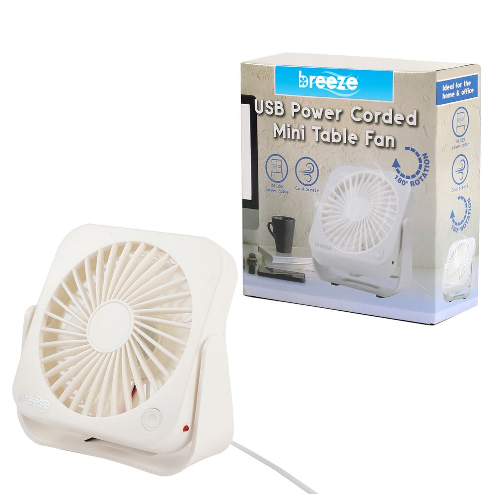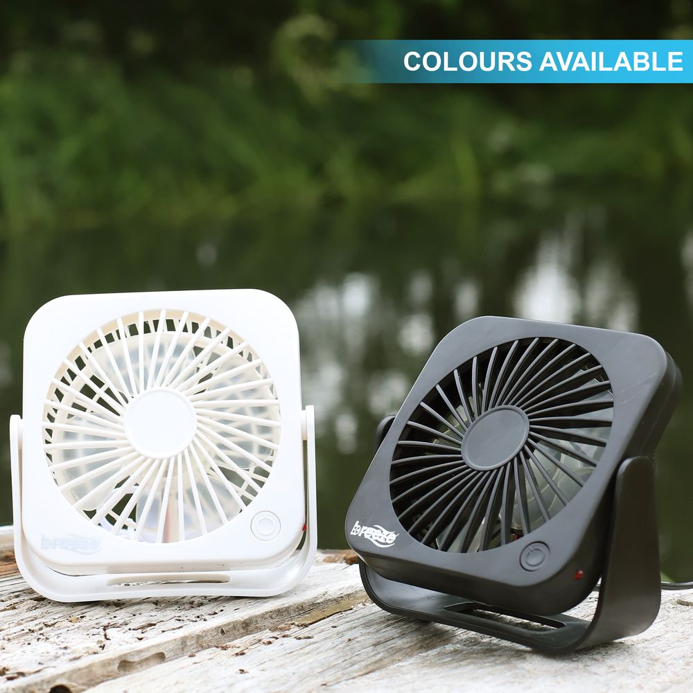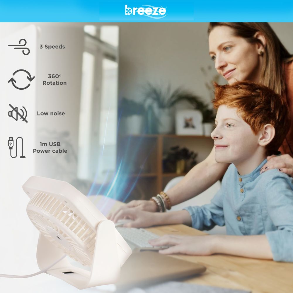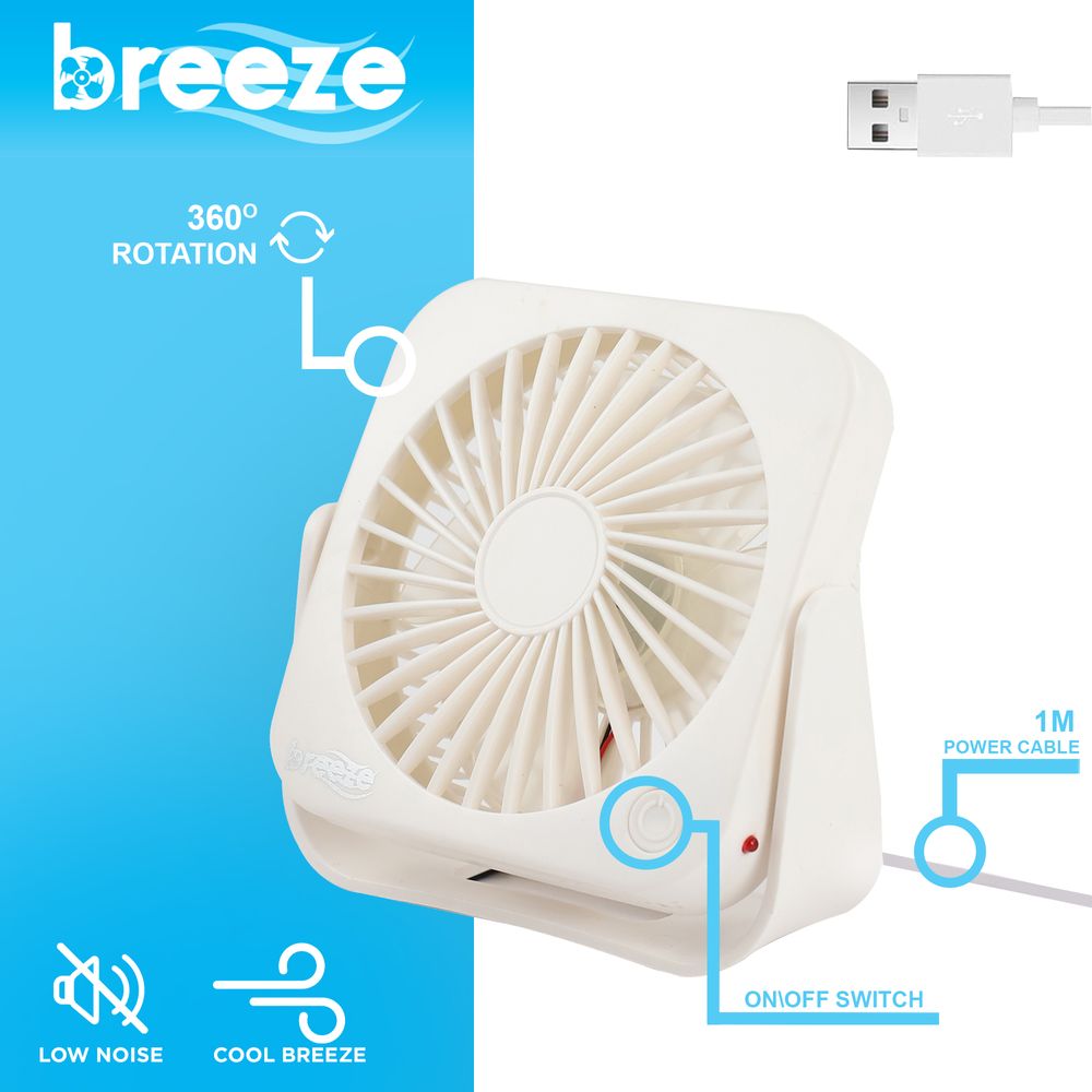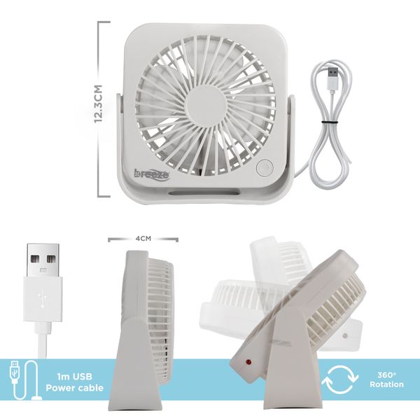 Ideal for the home and office. USB powered. 1 metre USB power cable. Low noise. 1 button ON/OFF switch. 1 speed. Cool breeze. 180 degree rotation. Available in 2 colours: White, Black.