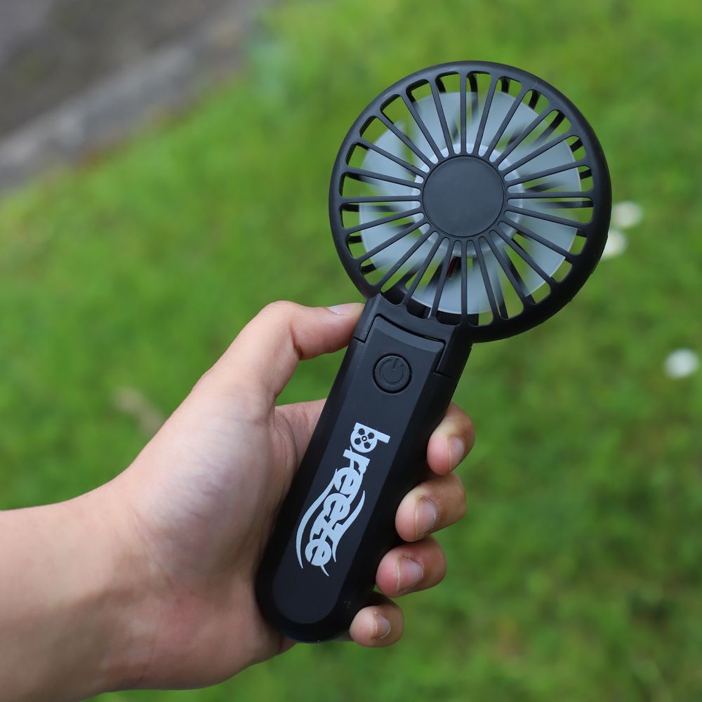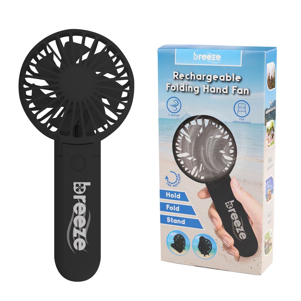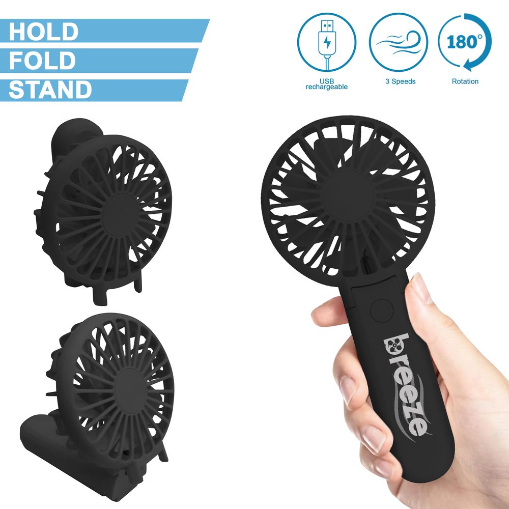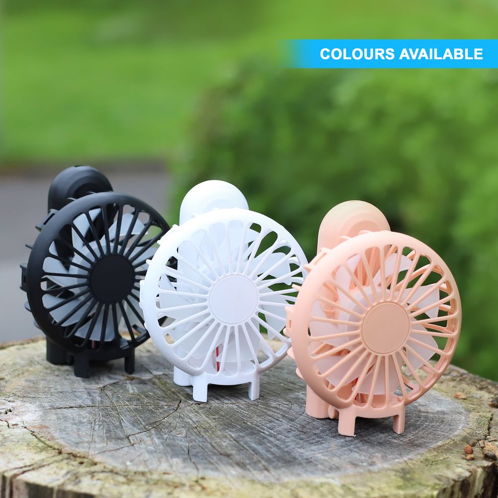 HOLD, FOLD, STAND. 800mAh. USB rechargeable. Low noise. 1 button ON/OFF switch. 3 speeds. USB cable included. 180 degrees rotation. Available in 3 colours:White, Pink, Black.