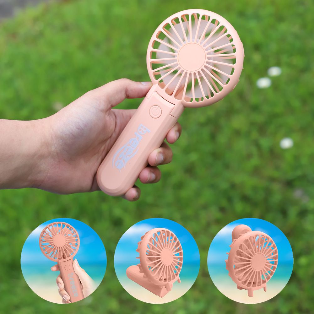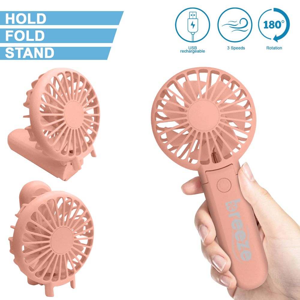 HOLD, FOLD, STAND. 800mAh. USB rechargeable. Low noise. 1 button ON/OFF switch. 3 speeds. USB cable included. 180 degrees rotation. Available in 3 colours:White, Pink, Black.