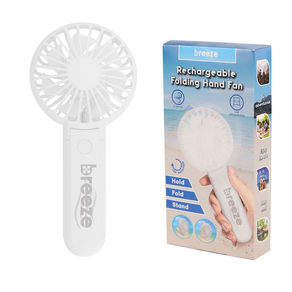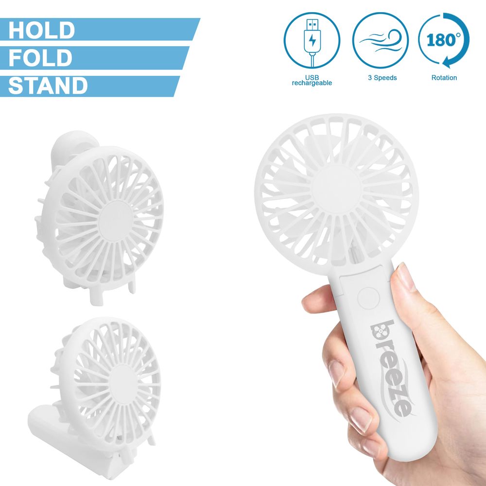 HOLD, FOLD, STAND. 800mAh. USB rechargeable. Low noise. 1 button ON/OFF switch. 3 speeds. USB cable included. 180 degrees rotation. Available in 3 colours:White, Pink, Black.