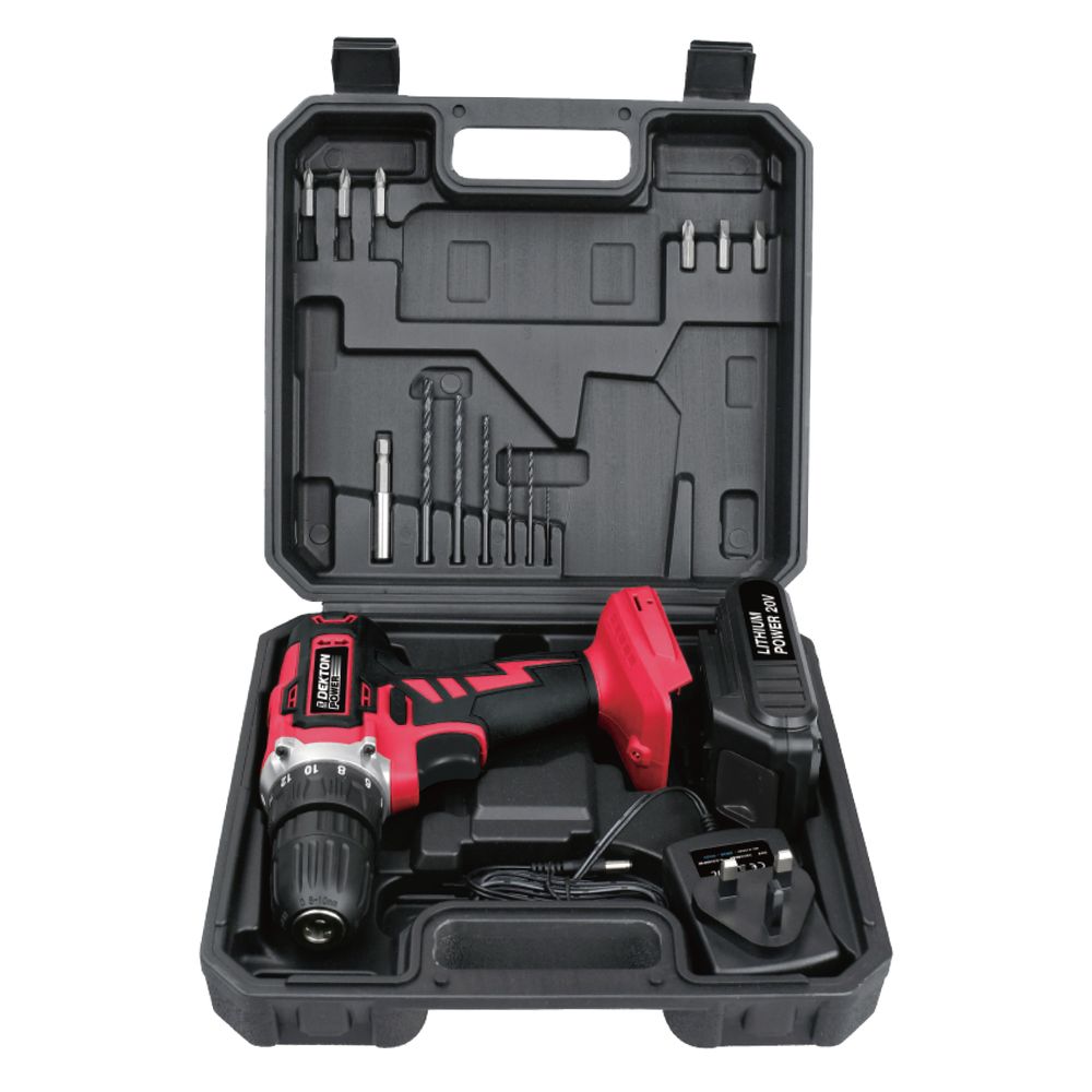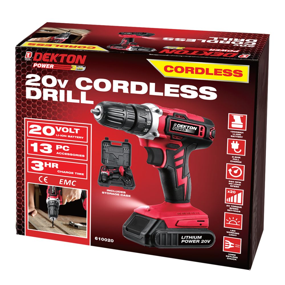 20 Volt Li – ion battery. 13 PC accessories. 3 HR charge time. 1300MAH. 3-5 HR full charge. 650 RPM no load speed. 20 torgue speed settings. LED working light. 10MM keyless chuck.