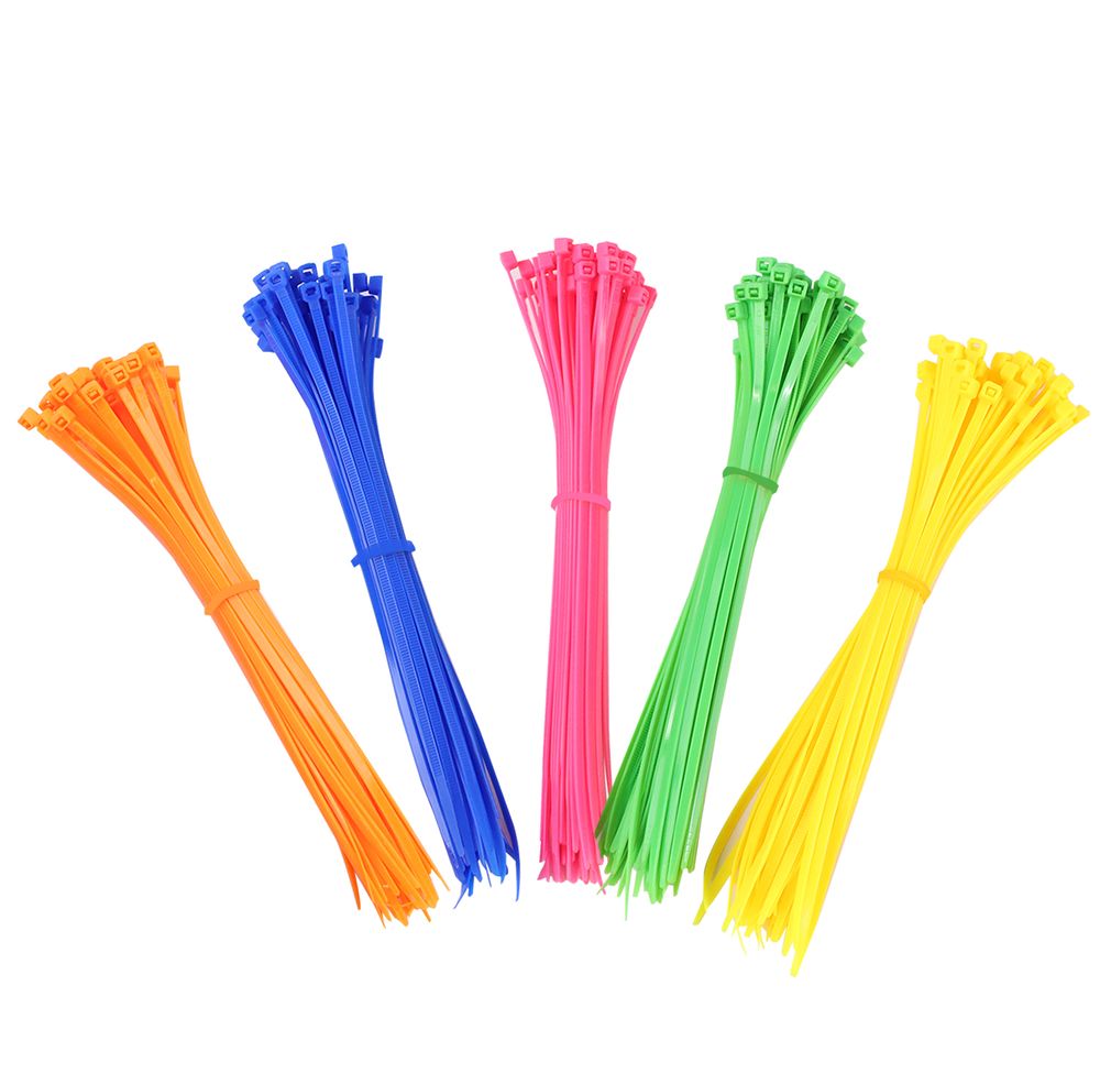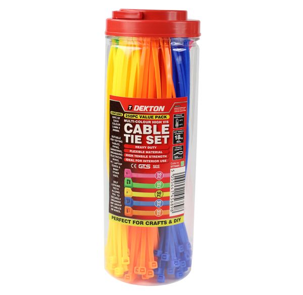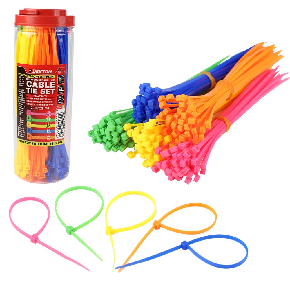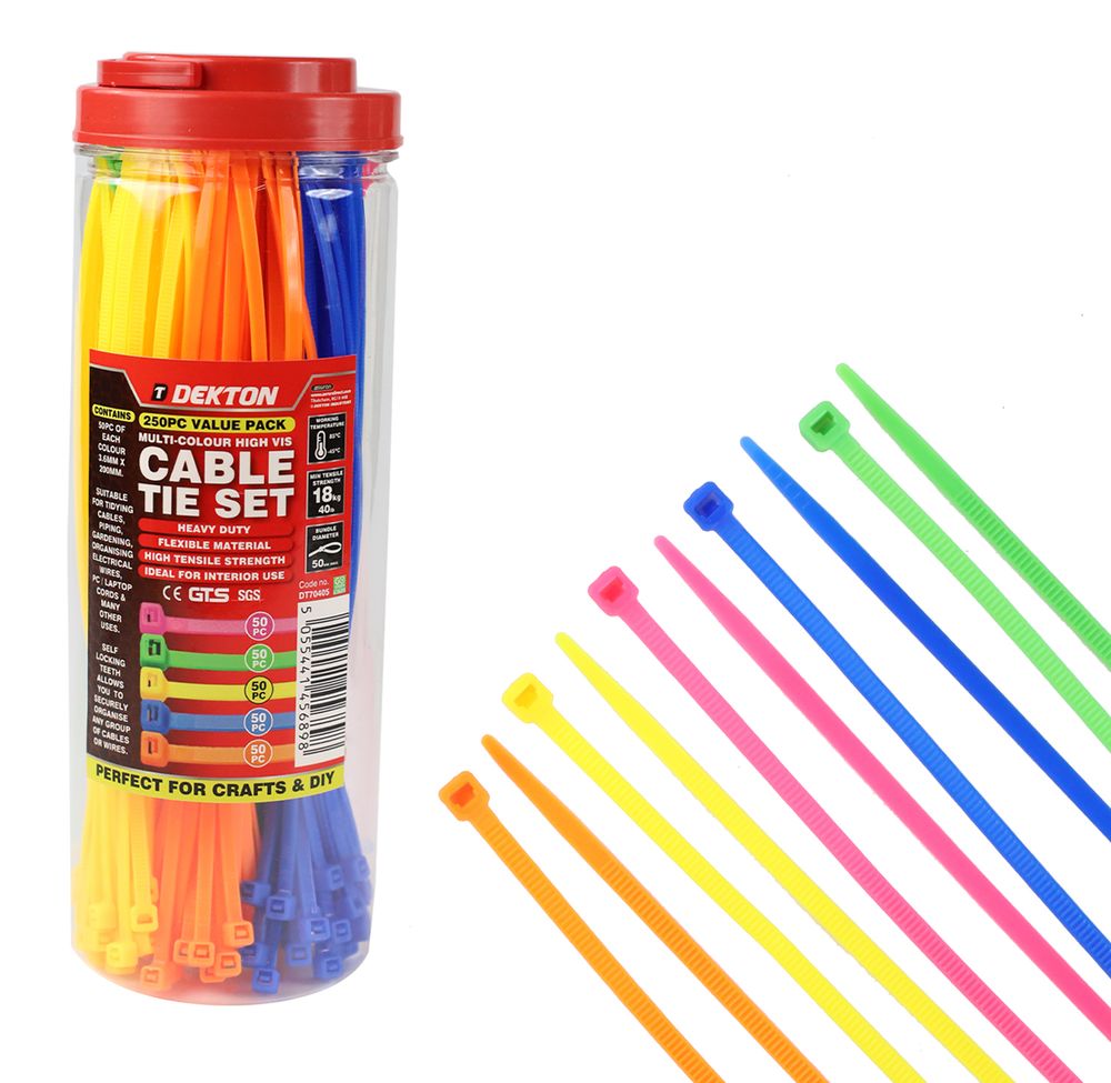 DEKTON 250PC CABLE TIE SET HI VIS 3.6MMX 200MM YELLOW, ORANGE, PINK, BLUE, GREEN