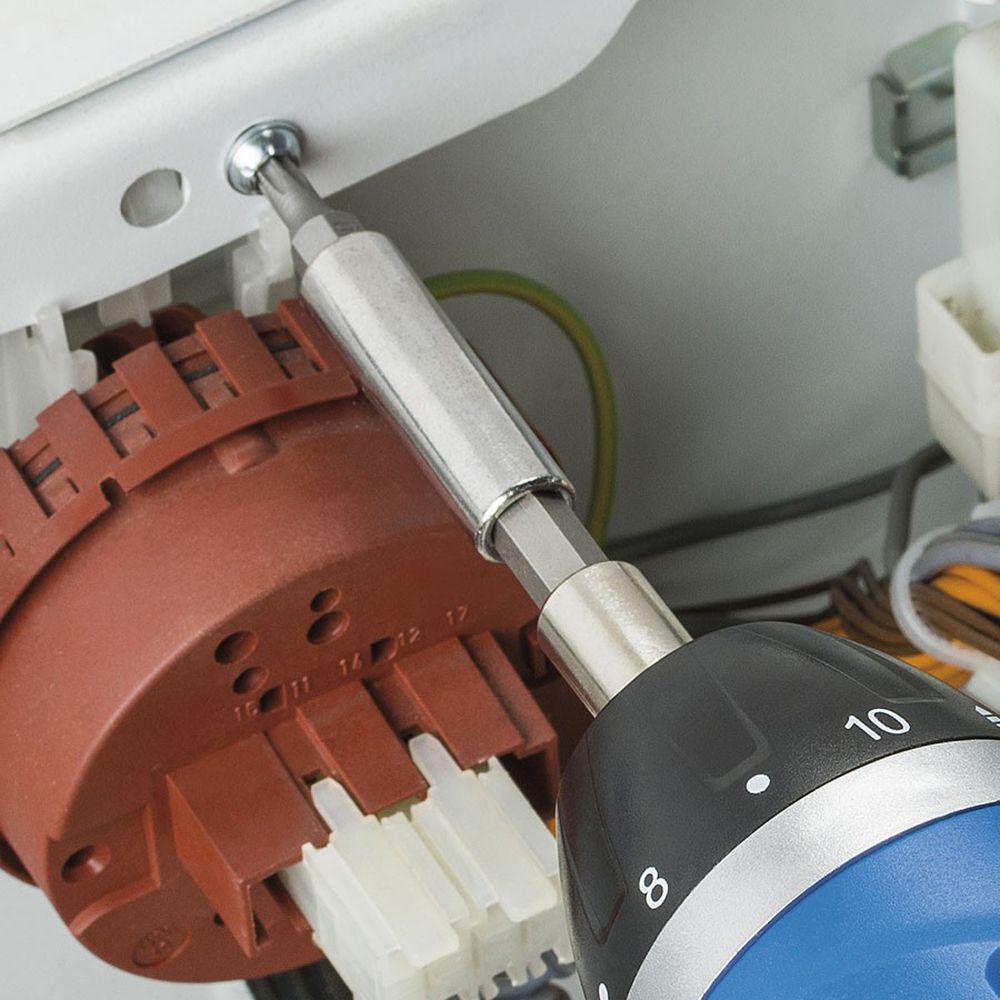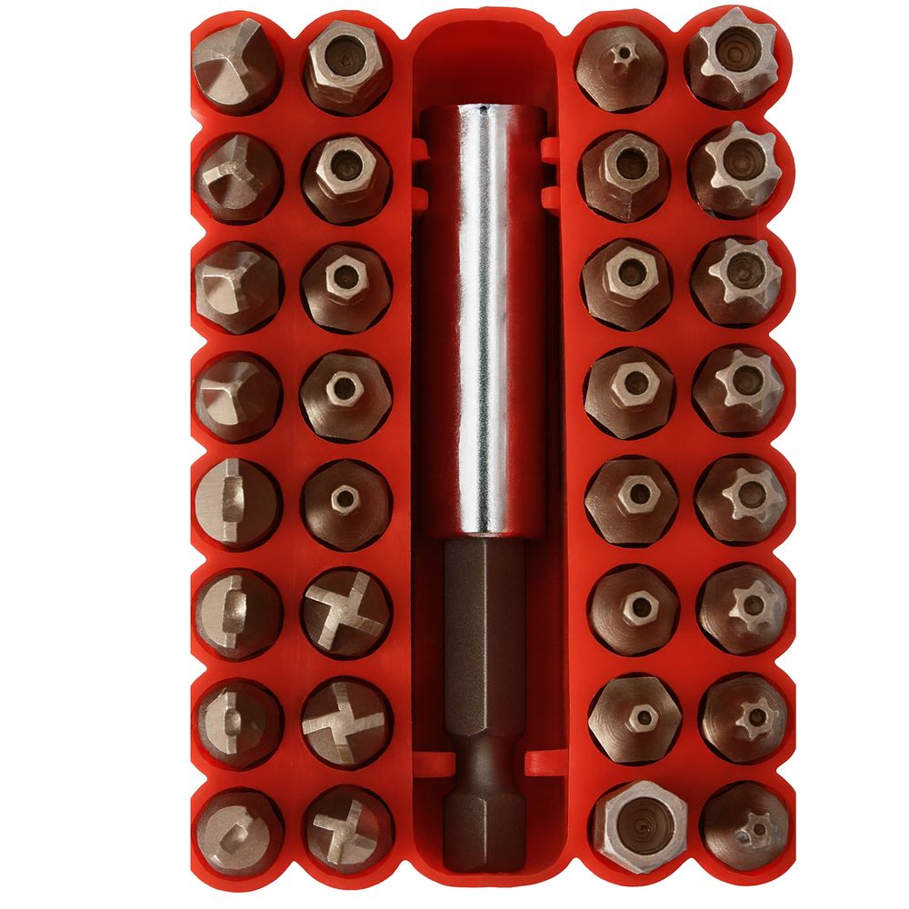 32 CRV steel bits and extension bar in a handy rubber bit housing.