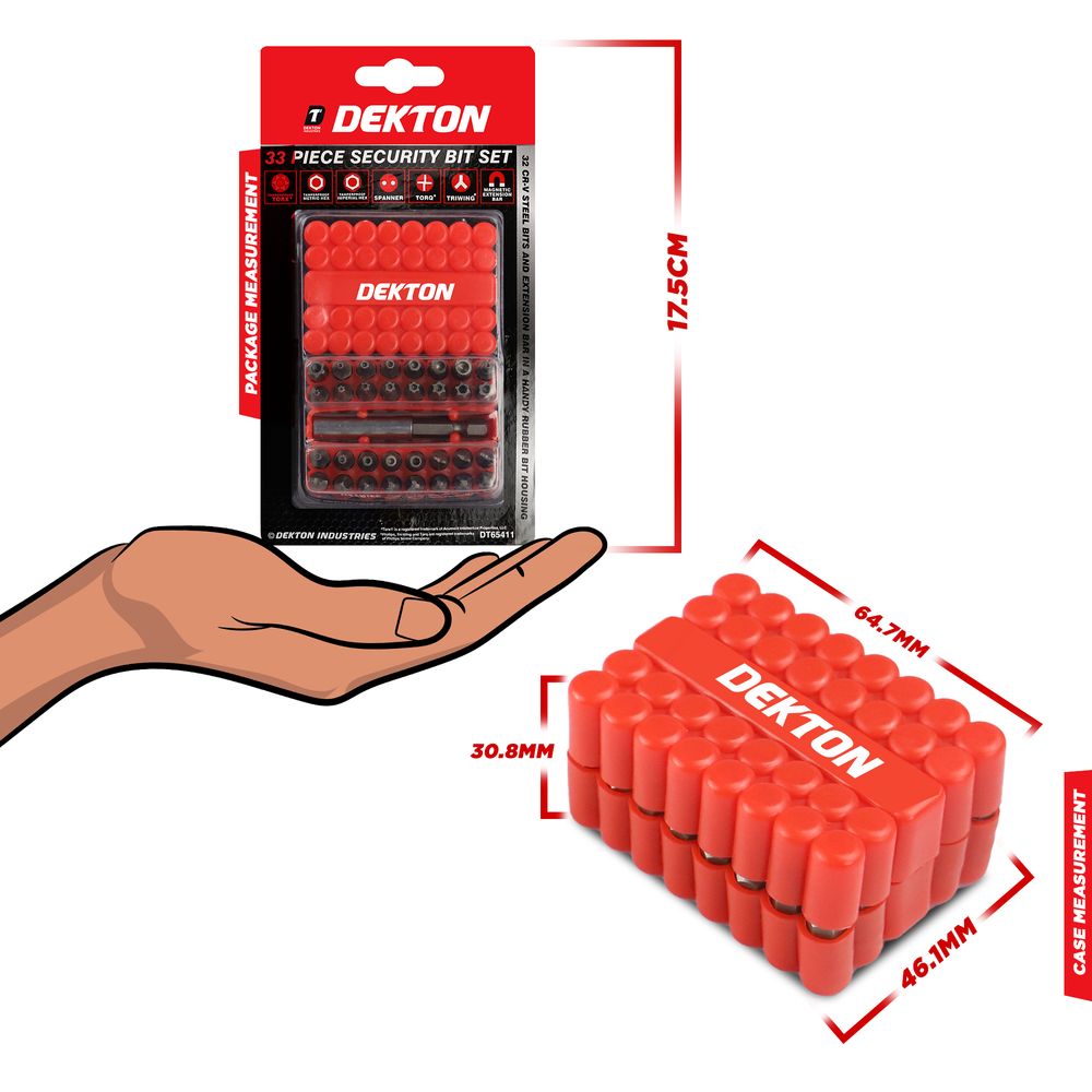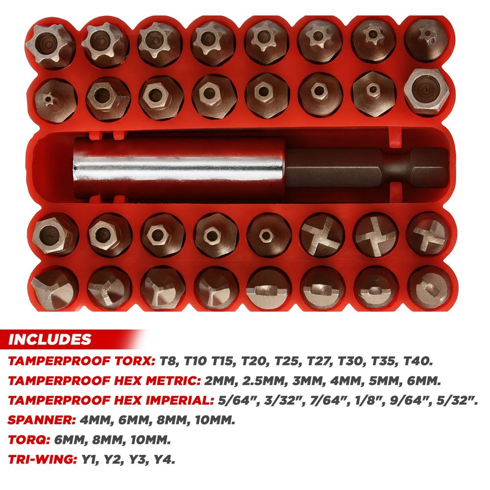 Includes: Magnetic extension bar: 60mm, Tamperproof Torx: T8, T10 T15, T20, T25, T27, T30, T35, T40. Tamperproof Hex Metric: 2mm, 2.5mm, 3mm, 4mm, 5mm, 6mm. Tamperproof Hex Imperial: 5/64″, 3/32″, 7/64″, 1/8″, 9/64″, 5/32″. Spanner: 4mm, 6mm, 8mm, 10mm. Torq: 6mm, 8mm, 10mm. Tri-Wing: Y1, Y2, Y3, Y4.
