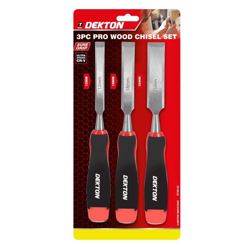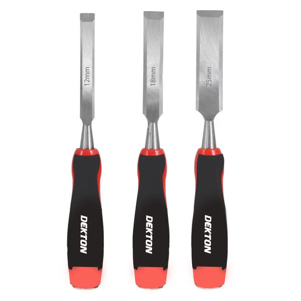 Professional quality chisels made from chrome vanadium steel. Heat treated and hardened for strength and durability. Finely ground, honed and sharpened blades for precise use. Ergonomic anti – slip grip soft handles. Sizes includes: 12mm, 18mm and 25mm. Striking caps. Bevelled Edges.