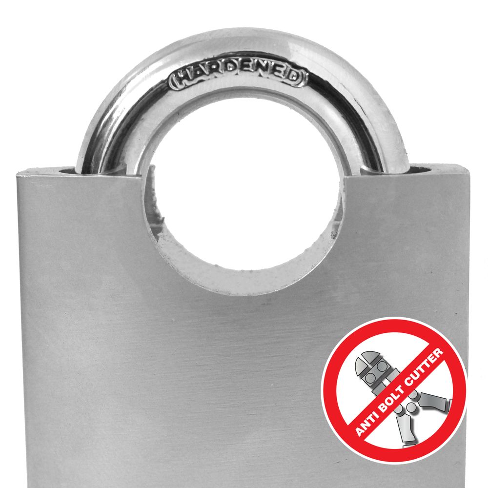 Hardened steel shackle, providing excellent level of security.