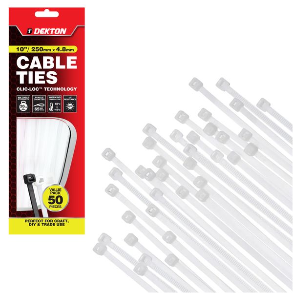 DEKTON 50 PCS 4.8MM x 250MM WHITE CABLE TIES