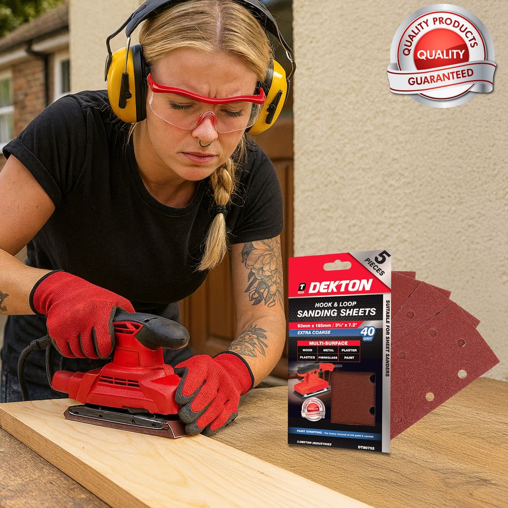 DEKTON 5PC HOOK AND LOOP SANDING SHEETS 93MMX185MM/ EXTRA COARSE – 40 GRIT