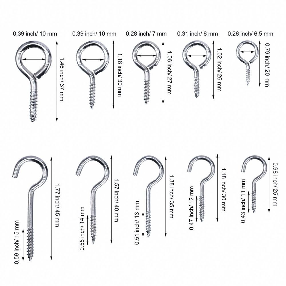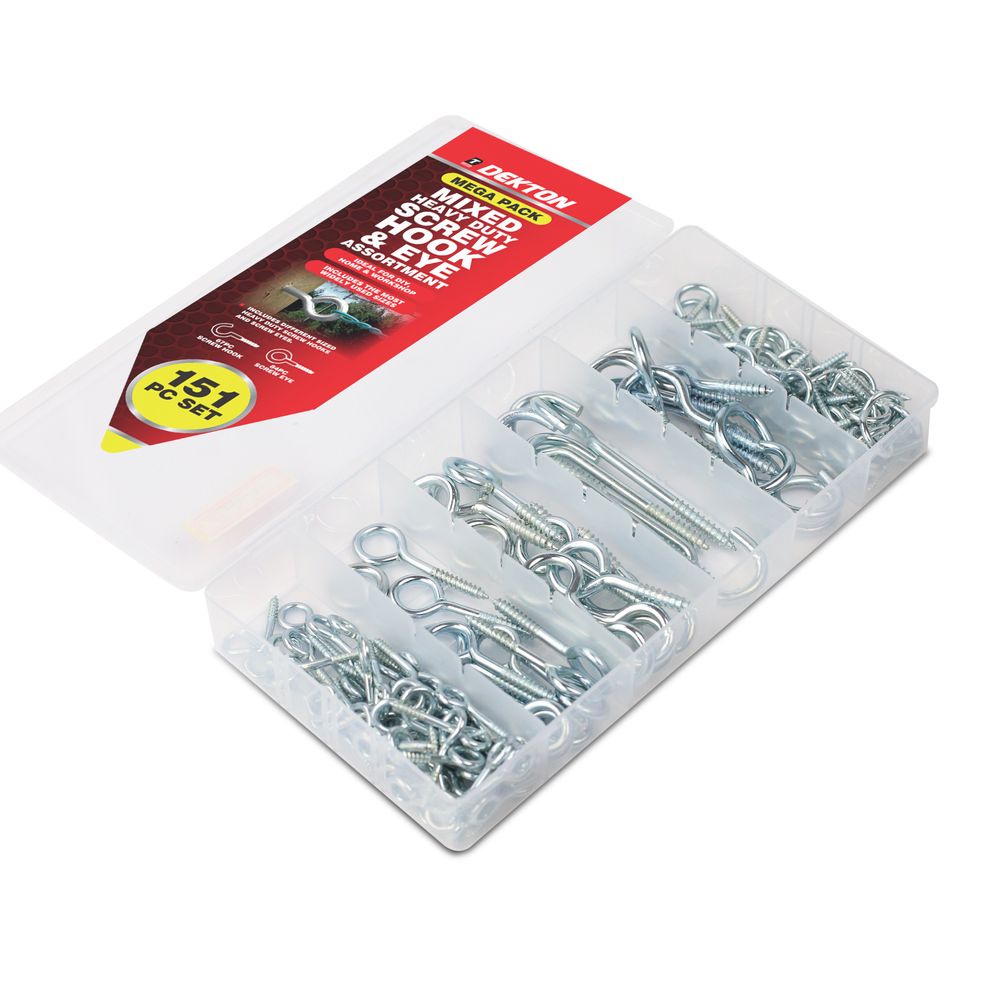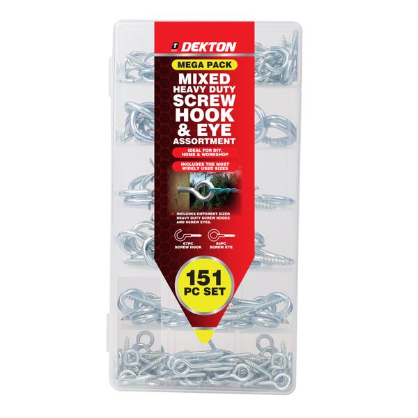 Ideal for DIY, home and workshop. Includes the most widely used sizes. Includes different sized heavy duty screw hooks and screw eyes.