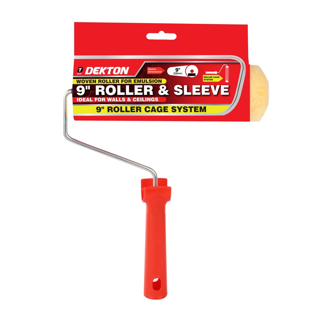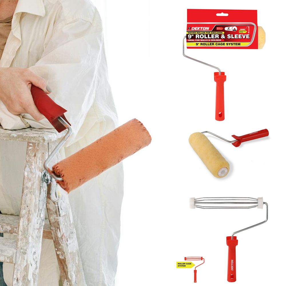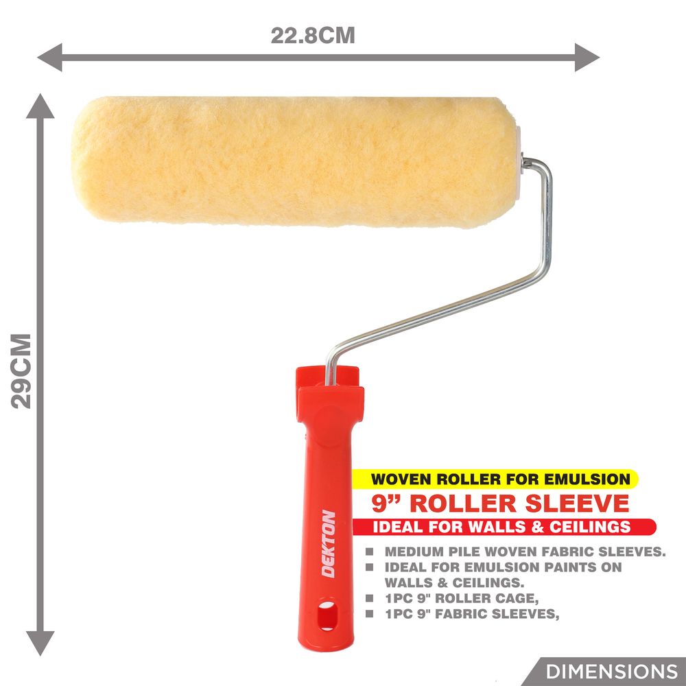Ideal for walls and ceilings, Medium pile woven fabric sleeves, Ideal for emulsion paints on walls and ceilings, 1PC 9” roller cage, 1PC 9” fabric sleeves.