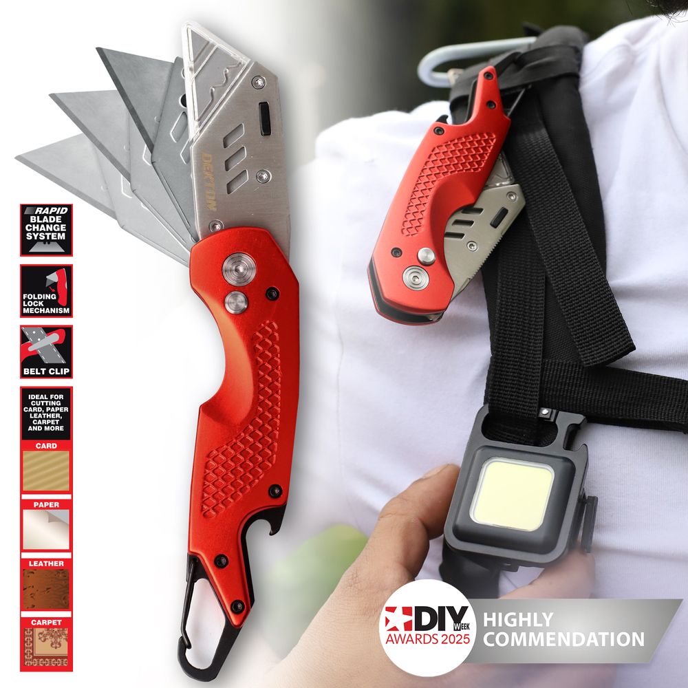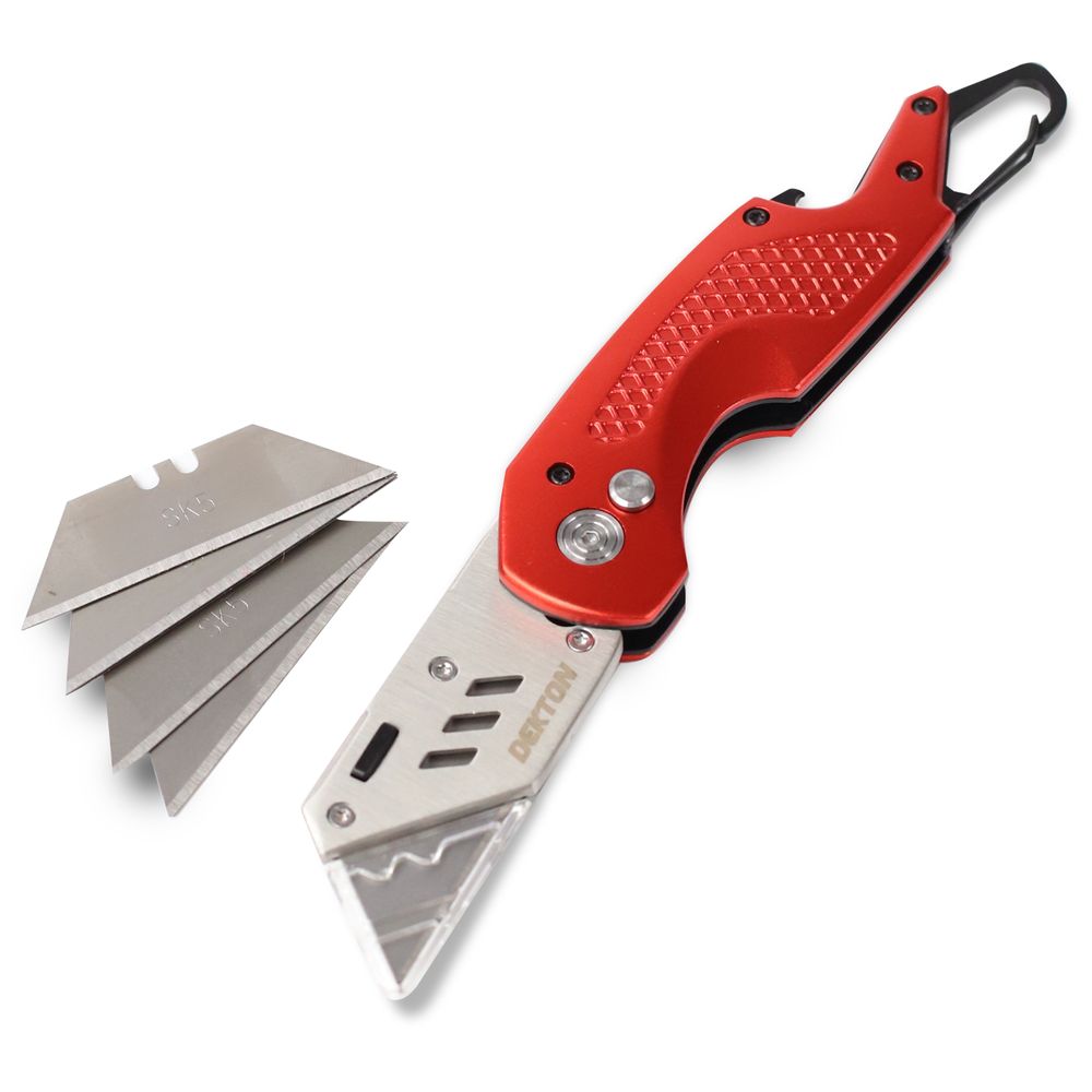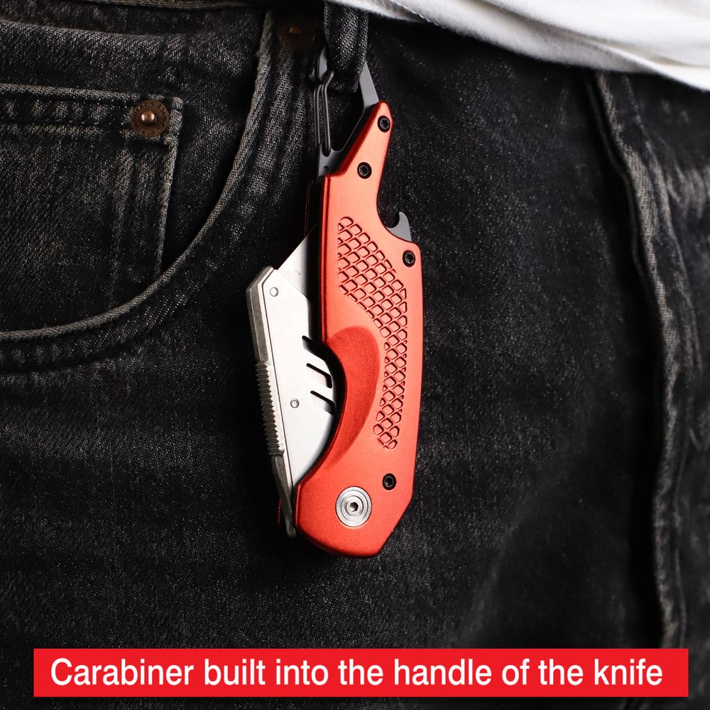 Professional fold back knife. Includes 5 extra blades. With carabiner handle . Heavy duty. Ideal for cutting card, paper, leather, carpet and more.