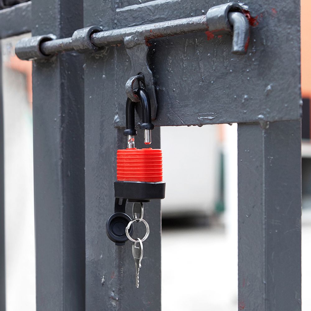 Heavy duty waterproof thermoplastic cover. Dual-locking levers. Pin tumbler mechanism 65mm shackle Includes 2 keys